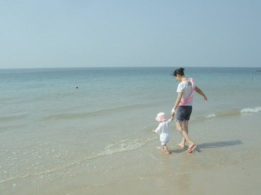 海灘上留下了無數(shù)指尖大小的小孔隙,出于好奇,我蹲下來靜靜地觀察,發(fā)現(xiàn)有小小的螃蟹從小孔隙里爬出來,象我一樣好好沐浴燦爛陽光、溫暖海風(fēng);有些頂著米粒大的沙團(tuán)推出小孔隙,原來是小螃蟹寶寶在造穴,多勤勞呀,從小就養(yǎng)成了愛勞動(dòng)的習(xí)慣;最好玩的是好不容易逮著一只螃蟹寶寶放在手心任其橫行霸道,直癢得我開懷大笑……..