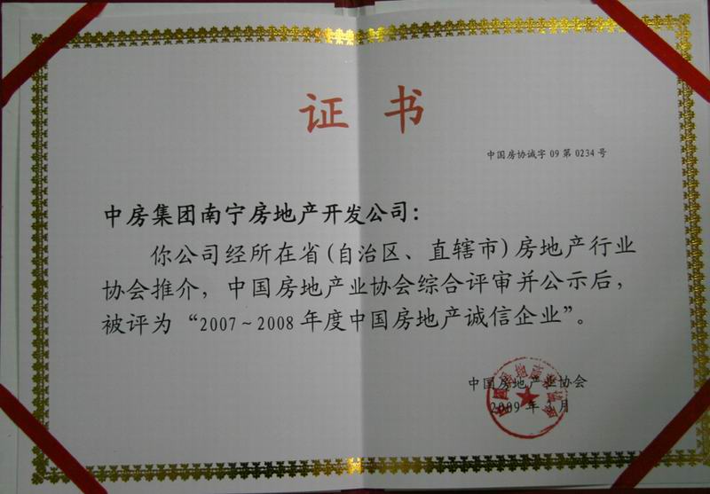 熱烈祝賀中房集團南寧房地產(chǎn)開發(fā)公司榮獲2007-2008年度中國房地產(chǎn)誠信企業(yè)