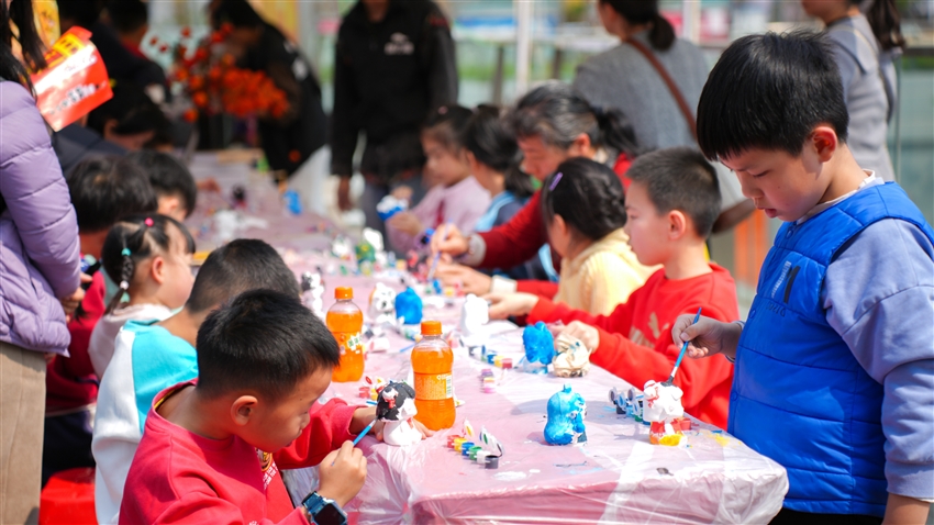 在創(chuàng)意手作區(qū),也吸引了眾多小朋友的目光。在這里大家可以用黏土塑造哪吒,用彩筆描繪敖丙,用糖畫勾勒太乙真人。還可以體驗漆扇、香囊等非遺手作。各種創(chuàng)意手作活動讓大小朋友們感受到了民俗文化與哪吒元素的奇妙融合,玩得不亦樂乎!